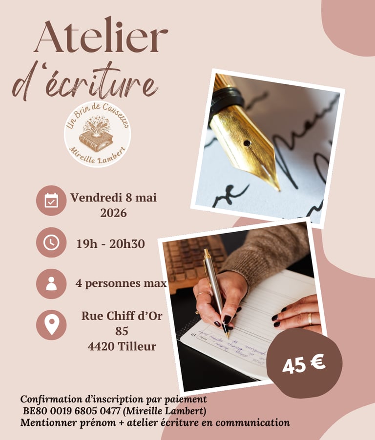 Inscription par mail : Unbrindecausettes@outlook.be, mentionne la date souhaitée dans le mail avec toutes tes coordonnées (nom, prénom et numéro de téléphone)